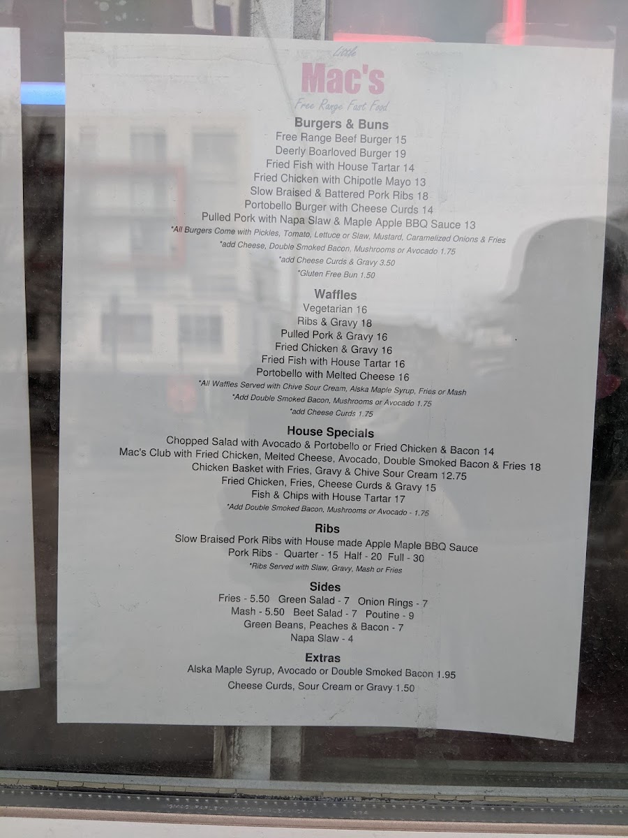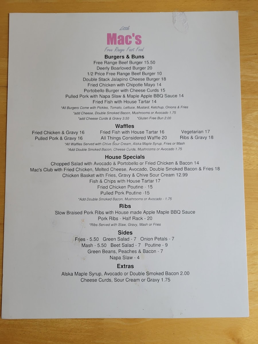 At Little Mac's, every dish is crafted with care, and their dedication to quality shines through. Notable mains include a Chop Salad topped with creamy avocado or crispy fried chicken, and the mouthwatering Braised Blueberry Sirloin with Mash & Gravy. Don't miss the crowd-favorite Deerly Boarloved Burger, paired perfectly with crispy sides, or the classic Fried Chicken & Fries that keeps patrons coming back for more. For those looking for a lighter bite, the Pickerel Fish & Chips is a must-try, capturing the essence of fresh, local flavors.
